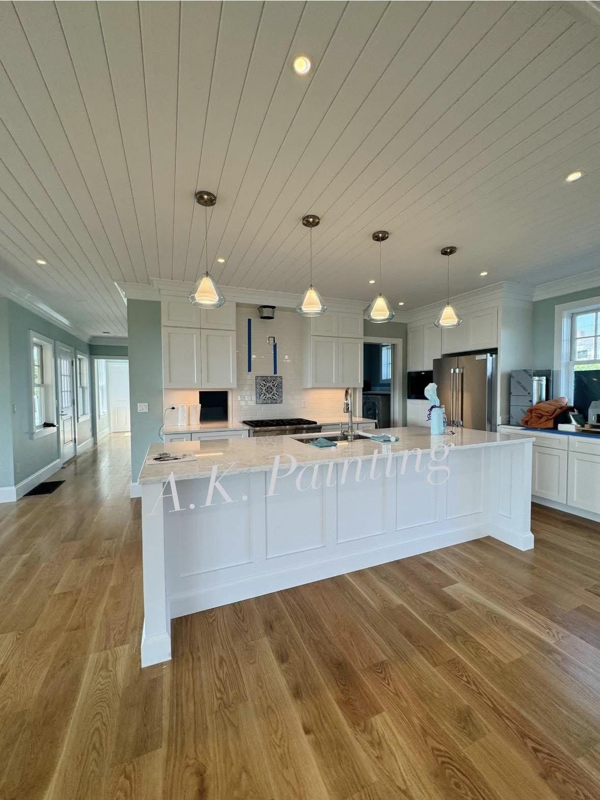 Fresh interior painting project in Little Compton, RI — bright white kitchen cabinets, walls, and ceiling refinished by A.K. Painting Inc. for a clean, modern look.